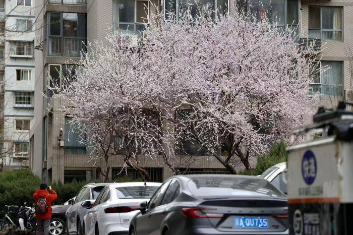 3月13日上午,北京东城区新景家园小区内三株相邻的山桃树迎来盛花期,粉白花朵层层叠缀,因树间距极近,在楼宇间织就一团蓬松的“花云”,成为市民春日打卡的热门点位。