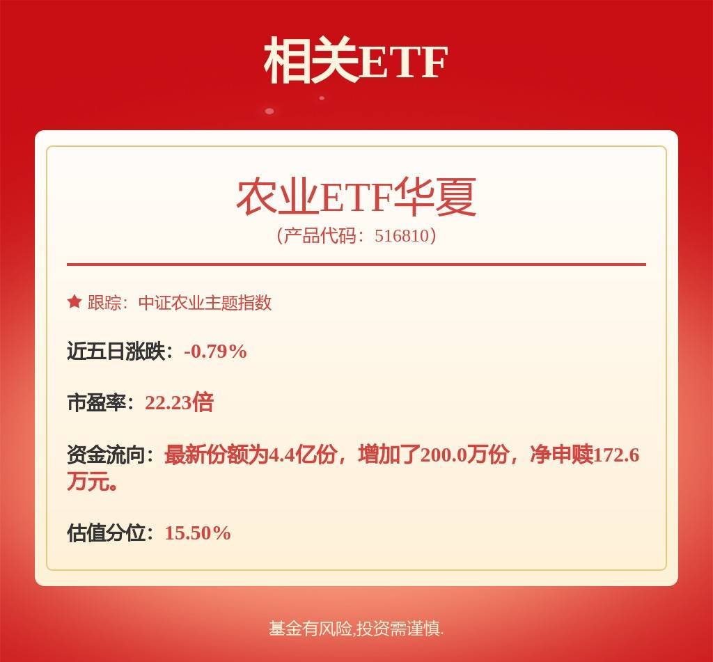 农业ETF华夏(516810.SH)持仓农业化工、种植业、生猪养殖等多个细分板块龙头,充分受益反内卷、化工周期、种业安全、猪周期反转等多重共振,目前估值处于历史低位水平。投资者可以借道ETF布局农业低位反弹机会,ETF有低门槛、分散风险的优势,同时被动跟踪指数,持仓透明、风格不漂移。联接A:016077;联接C:016078。